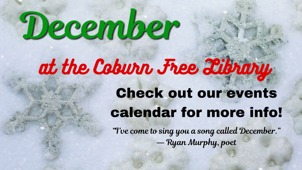 The Coburn Free Library has an exciting line-up of events this December. Join us at a CFL program where learning is fun! Use our events page or contact the library to register.