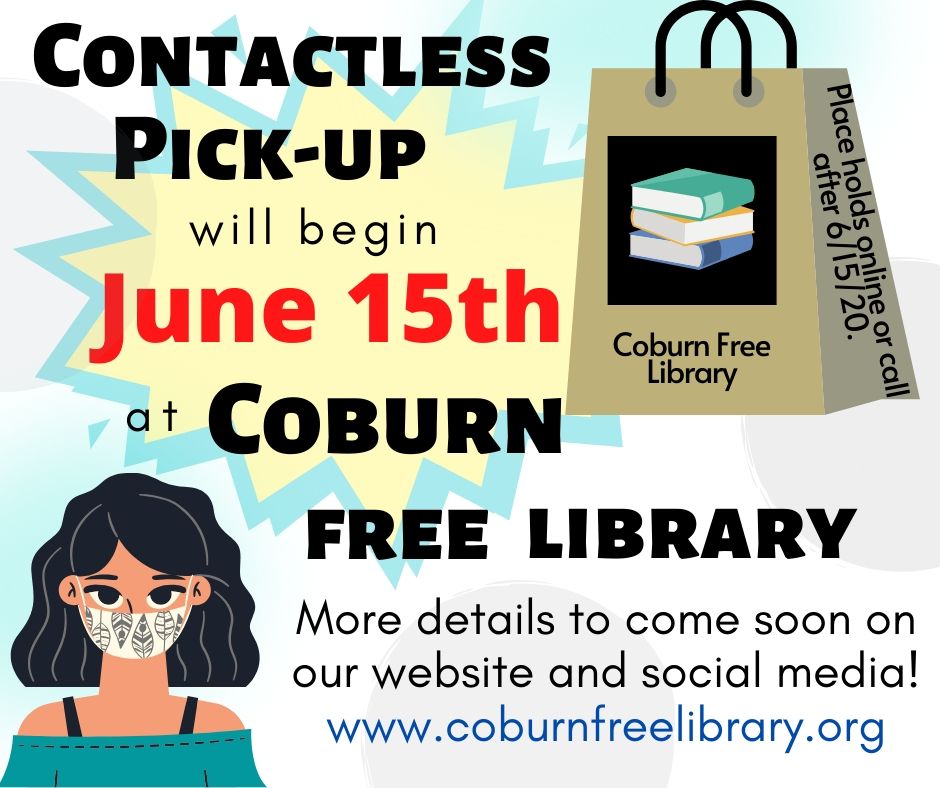 Coburn Free Library will re-open its doors on June 15, 2020 for contactless pick-up.  Pick-up hours will be MWF from 11am-12pm and 1pm-3pm & Tu/Th 3pm-4pm and 5pm-7pm.  You may begin putting items on hold now.  Remember you may only request items available in the Coburn Free Library building.  Interlibrary loans are not available at this time.  You CAN specify the holding library as your pick-up library and go there to pick up your items.   We hope you are as excited as we are to have the library open again!