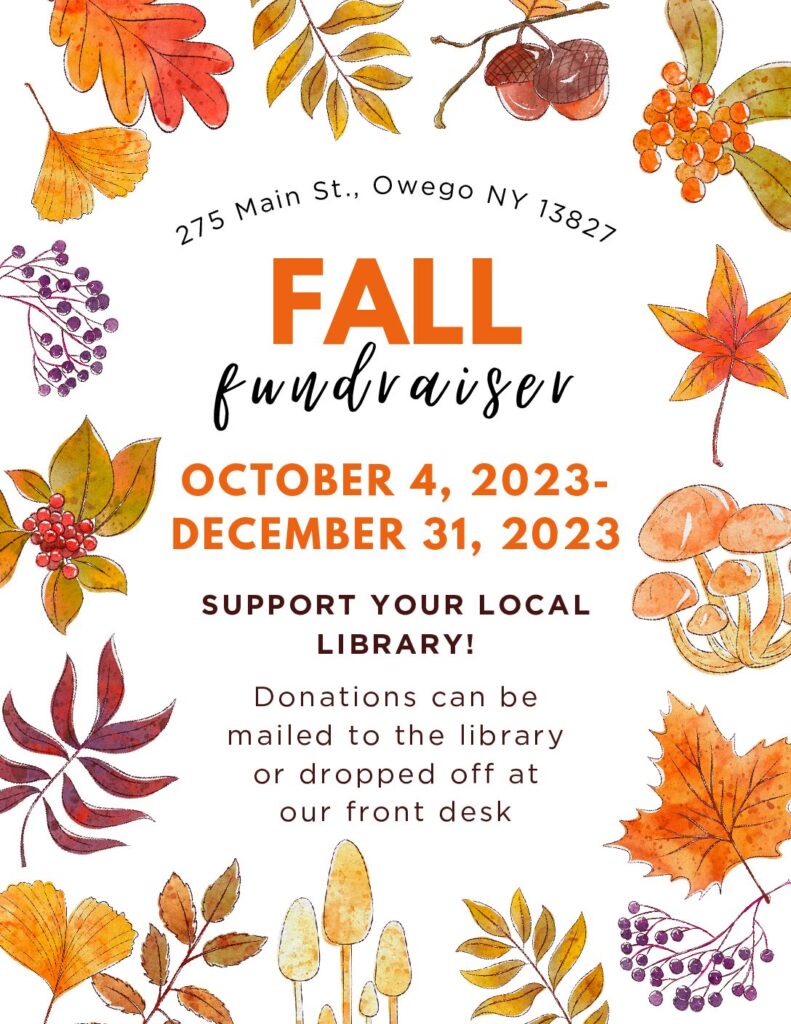 Support your local library! October marks the start of our fall fundraiser campaign. Mail or stop by the library front desk to make donations. The contributions you make ensure that the library can continue to provide quality service to the entire community!