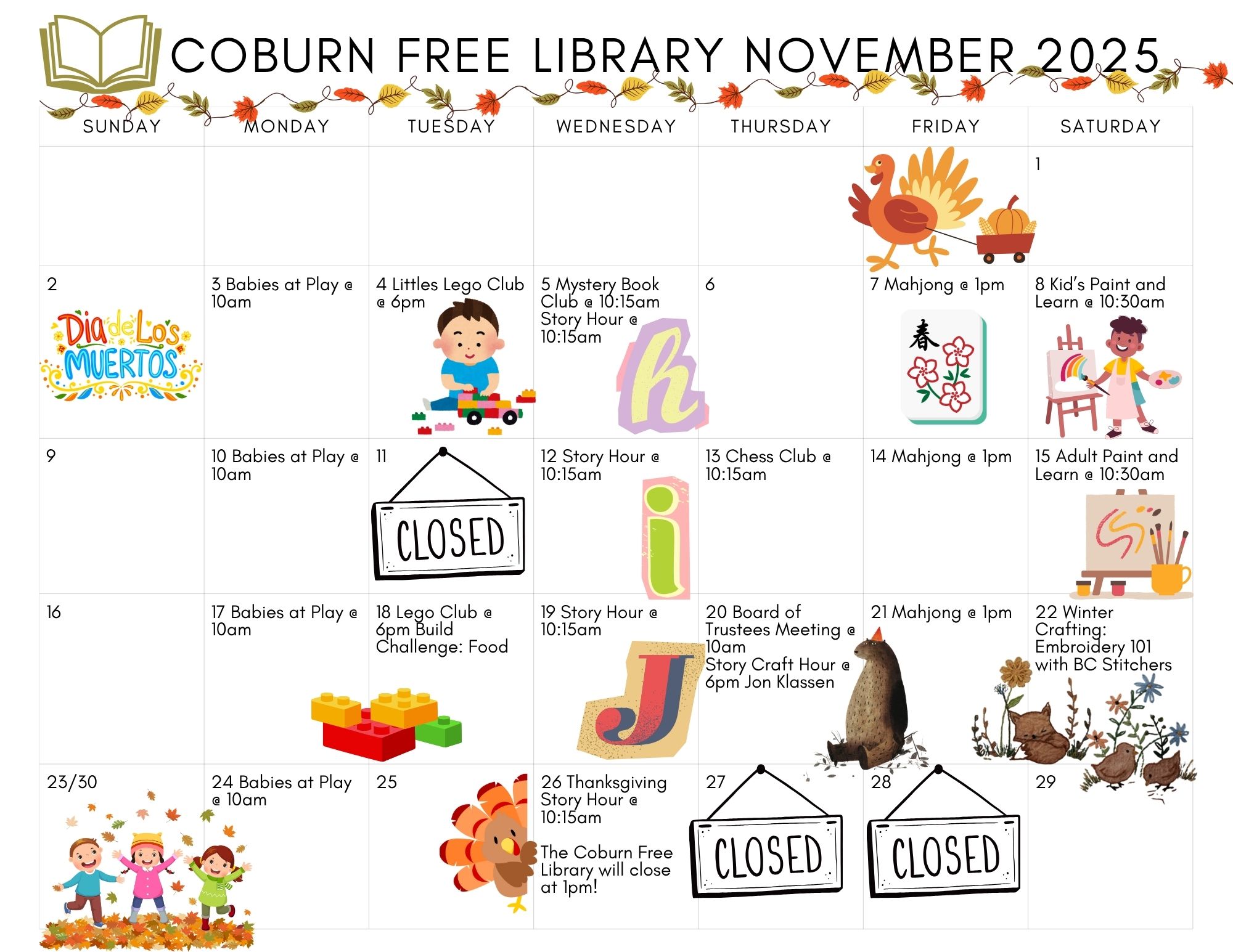 Current AnnouncementsPrograms November 2025 Events October 31, 2025 Mikayla Worzel Check out all the fun things happening in November! 2025 Coburn Program Calendar (7)Download