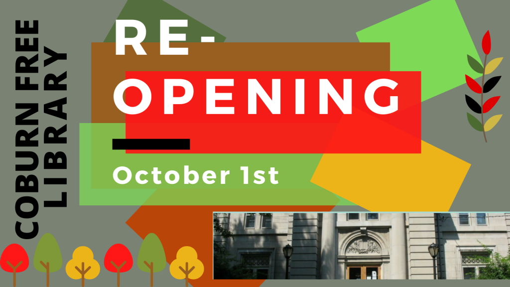 The Coburn Free Library located at 275 Main Street, Owego, will RE-OPEN on October 1st for limited services. To ensure public safety, we will open with the following precautions: